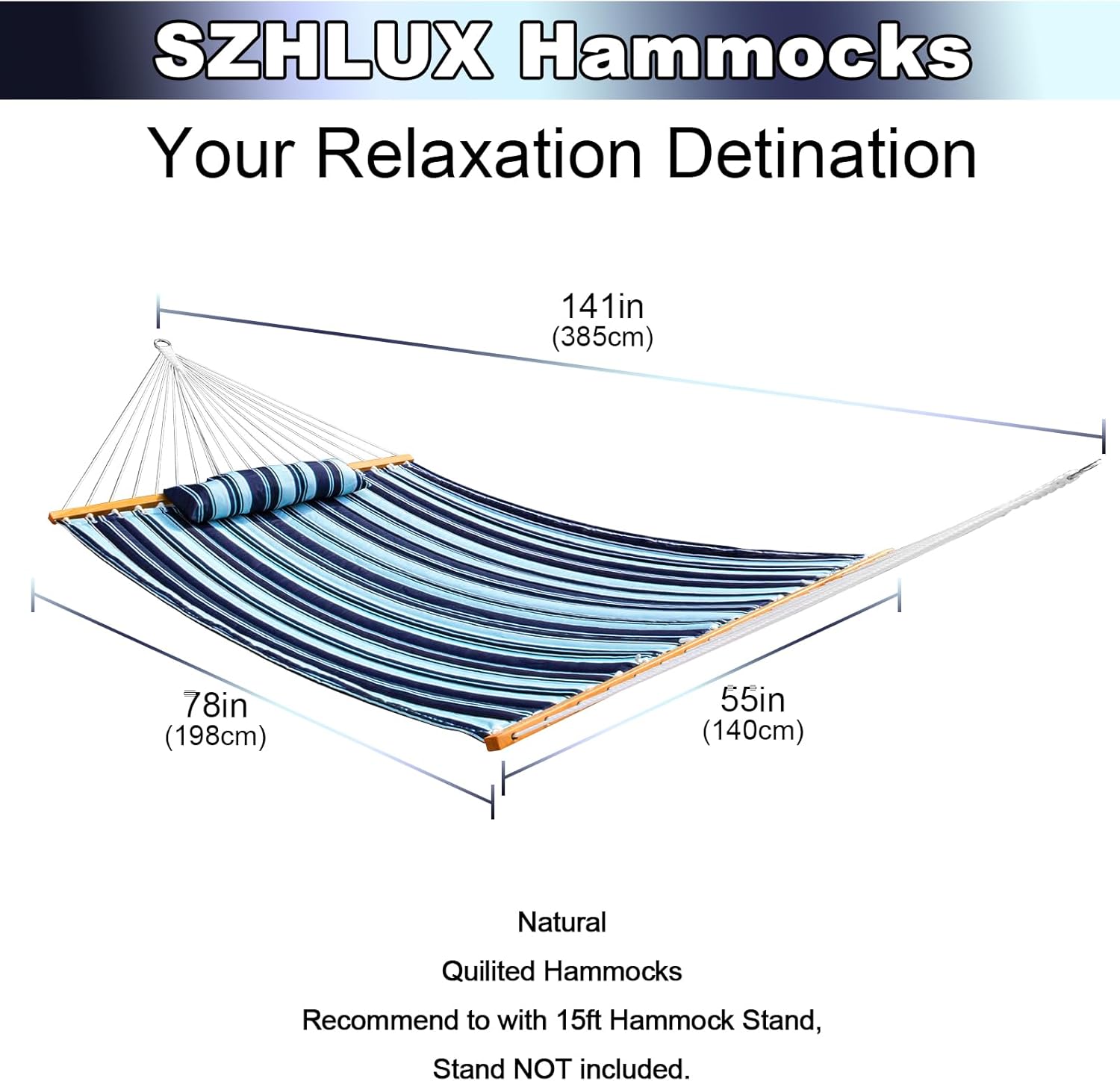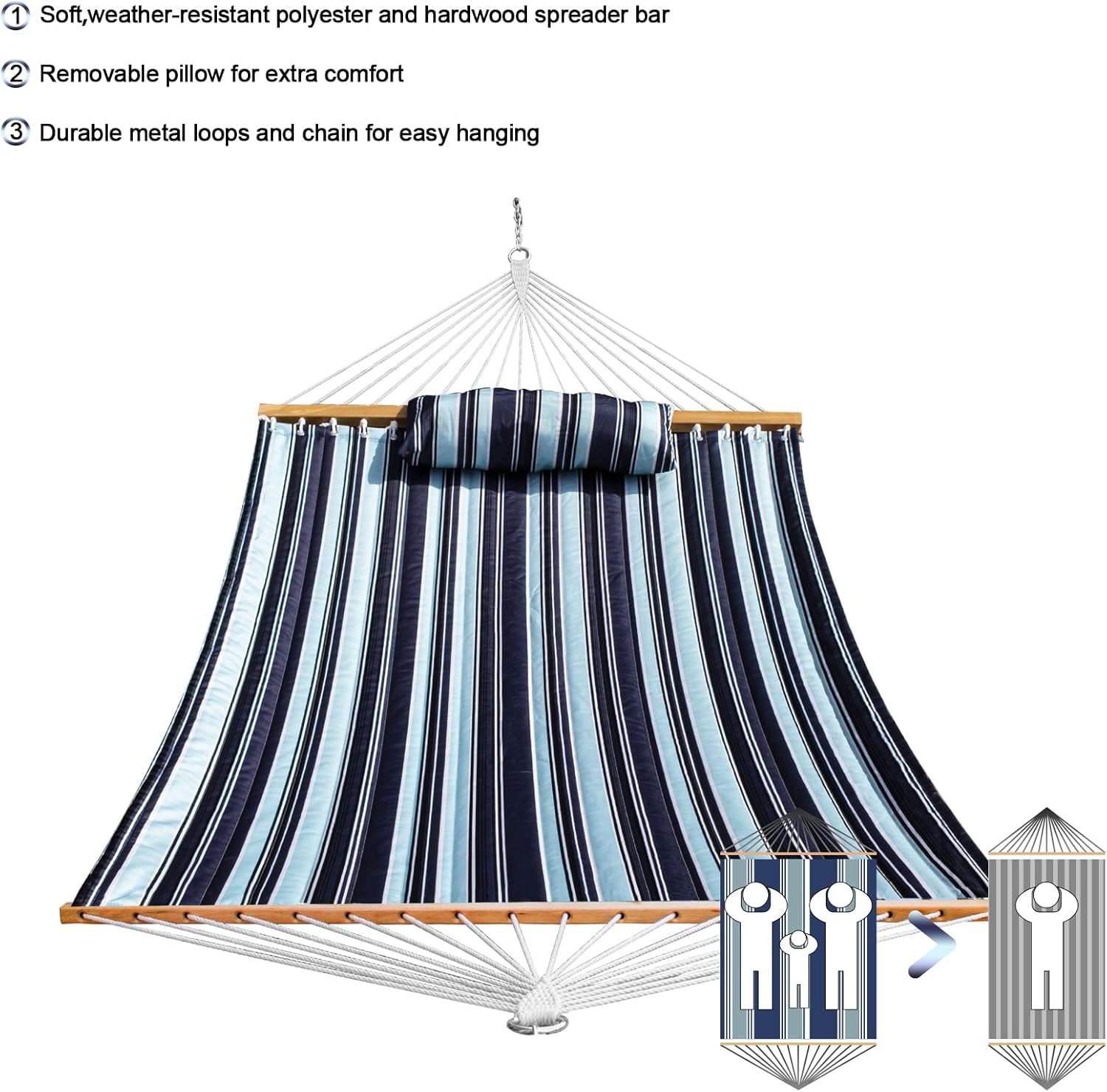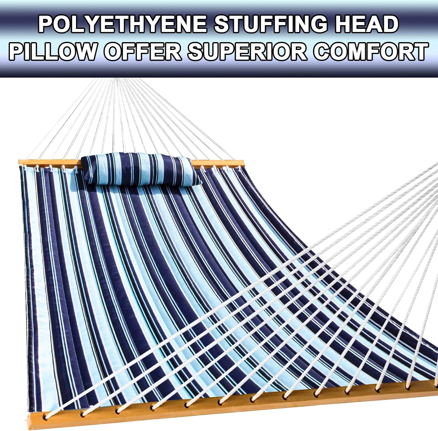 SZHLUX Outdoor Quilted Fabric Hammock with Spreader Bars and Detachable Pillow and Chains,Outdoor Patio Backyard Poolside, 450 LBS Weight Capacity, Catalina Beach